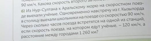 5 Реши задачи при помощи уравнения. 6) Из Нур-Султана к Аральскому морю на скоростном поез- де выехали учёные. Одновременно навстречу из г. Кызылорда в столицу выехали школьники на поезде со скоростью 90 км/ч. Через сколько часов поезда встретятся на одной из станций, если скорость поезда, на котором едут учёные, — 120 км/ч, а расстояние между городами 1 260 км?