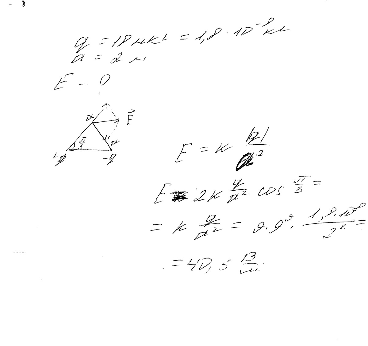 одинаковые по модулю,но разные со знаком заряды 18 нКл розтавлены в двух вершинах равностаронего треугольника с стороной 2м.найти напрежонность эликтрического поля в третей вершине триугольника