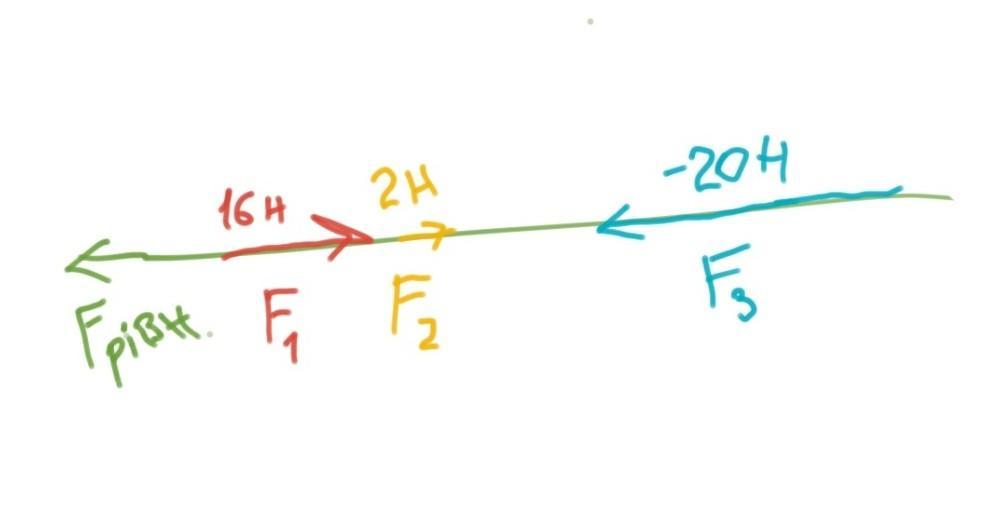 Три сили спрямовані вздовж однієї прямої: вправо 16 Н і 2 Н, а вліво 20 Н. Чому буде дорівнювати рівнодійна цих сил і куди вона буде напрямлена?