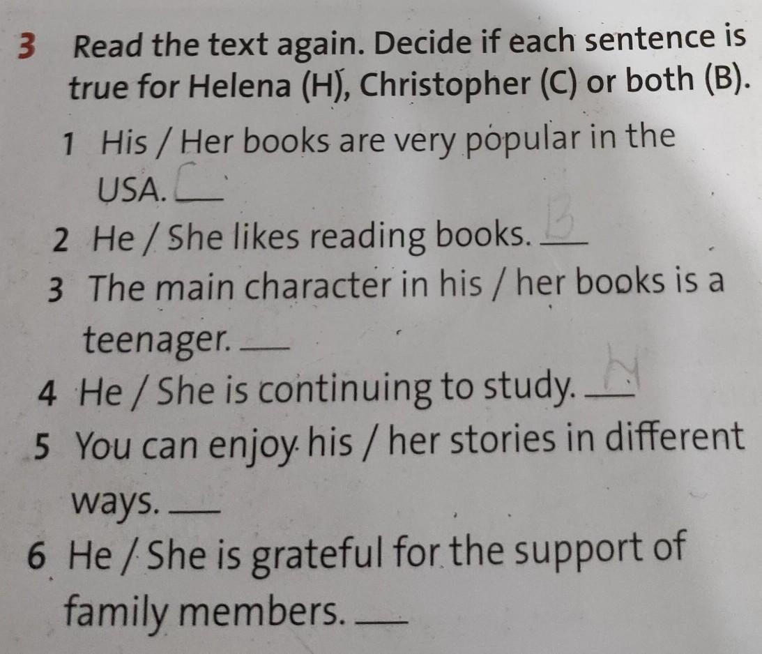 3 Read the text again. Decide if each sentence is true for Helena (H), Christopher (C) or both (B). His/Her books are very popular in the USA.C 1 2 He/She likes reading books. 3 The main character in his/her books is a teenager. 4 He/She is continuing to study. 5 You can enjoy his/her stories in different ways. 6 He/She is grateful for the support of family members.