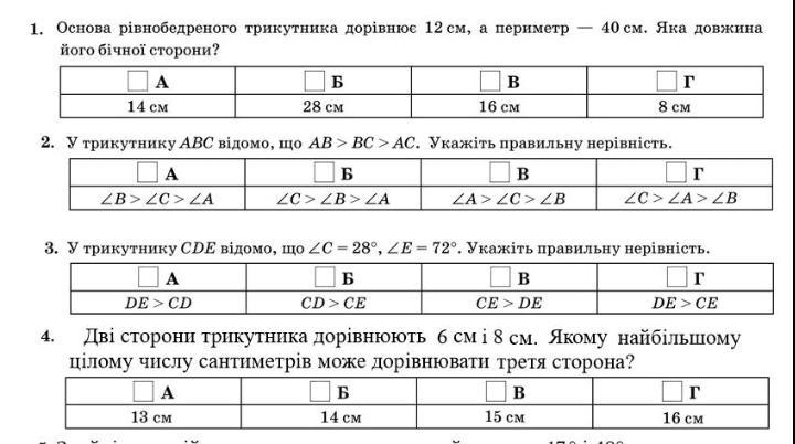 1. Треба периметр відняти від основи, щоб дізнатися суму бічних сторін 40-12=28 - це сума двох бічних сторін, у рівнобедреного трикутника бічні сторони рівно, то треба щоб дізнатися суму одної сторони треба