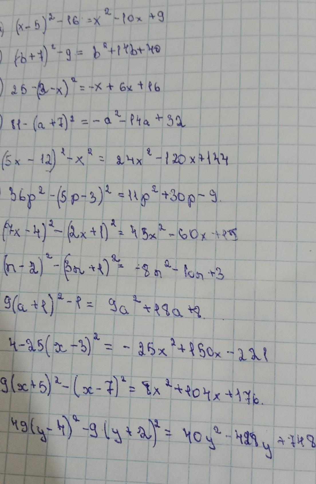 a) (x-5)²-16; 6) (b+7)²-9; B) 25-(3-x)²; r) 81-(a+7)²; A) (5x-12)²-x²; e) 36p²-(5p-3)²; *) (7x-4)²-(2x+1)²; 3) (n-2)²-(3n+1)²; и) 9 (a + 1)²-1; K) 4-25 (x-3)²; JI) 9 (x+5)²-(x-7)²; M) 49 (y-4)²-9(y + 2)². помните срочно даю 25 балов