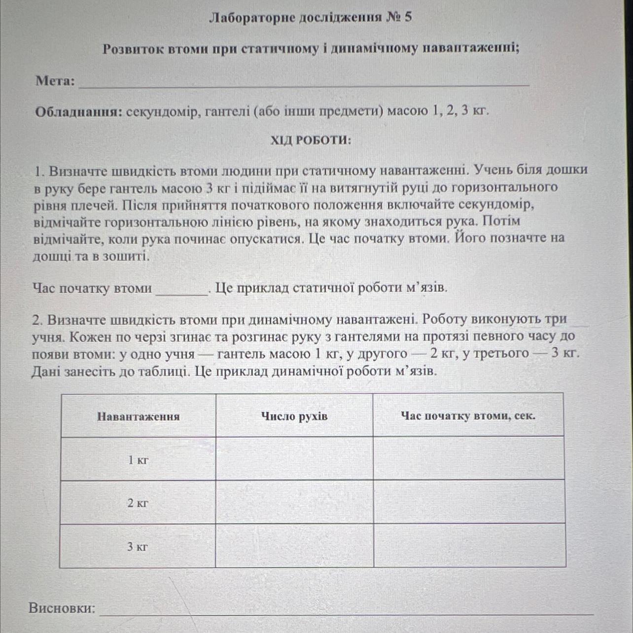 Обладнання: секундомір, гантелі (або інши предмети) масою 1, 2, 3 кг.
