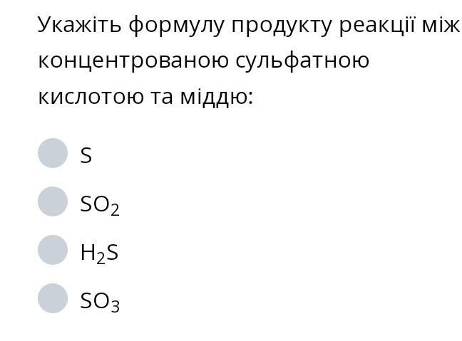 Мідь (Cu) реагує з концентрованою сульфатною кислотою (H2SO4) за утворення сульфату міді(II) та діоксиду сульфуру (SO2):