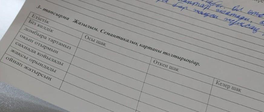 Жазылым. Семантикалық картаны толтырындар. Осы шак Өткен шак Етістік Бiз келдiк это кен achan полуси жульсаць дыбы домбыра тартамыз окып отырмын сахнада койылады жаксы орындады ойнап жатырсын Келер шак