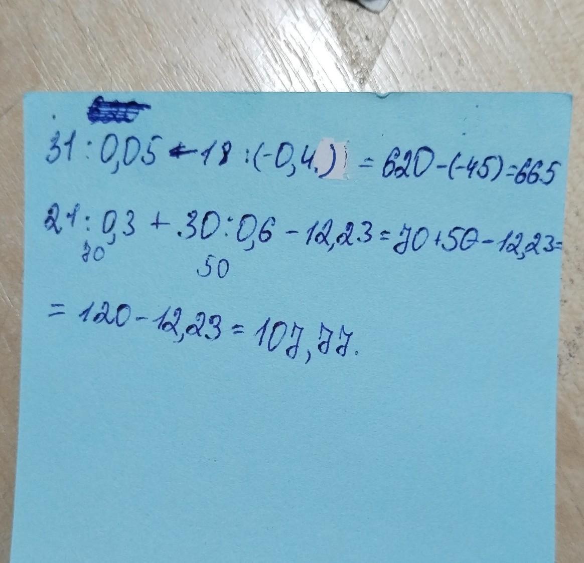 Вычислите значение выражения 31:x-18:у, если х=0,05 и у-0,4 2) Вычислите значение выражение выражений 21:a+30:b-12,23, если a=0,3 и b=0,6