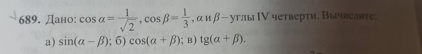 Дано: cosa= 1/√2, cosb = 1/3, a и b - углы 4 четверти. Вычислите: а) sin (a-b); б) cos (a+b); в) tg (a+b)