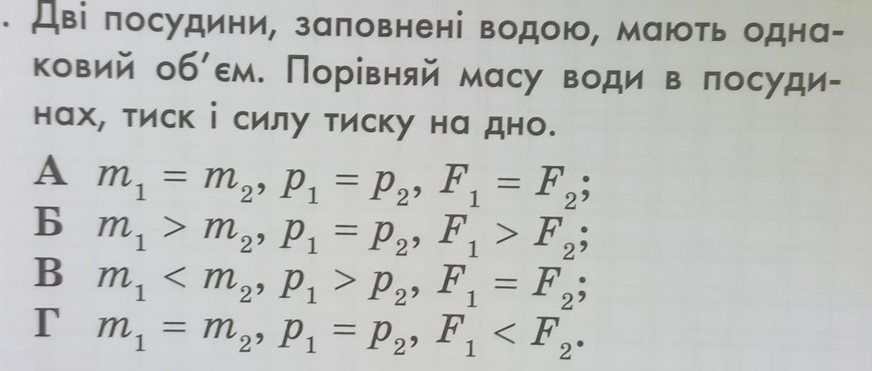 4. Дві посудини, заповнені водою, мають одна- ковий об'єм. Порівняй масу води в посуди- нах, тиск і силу тиску на дно.
