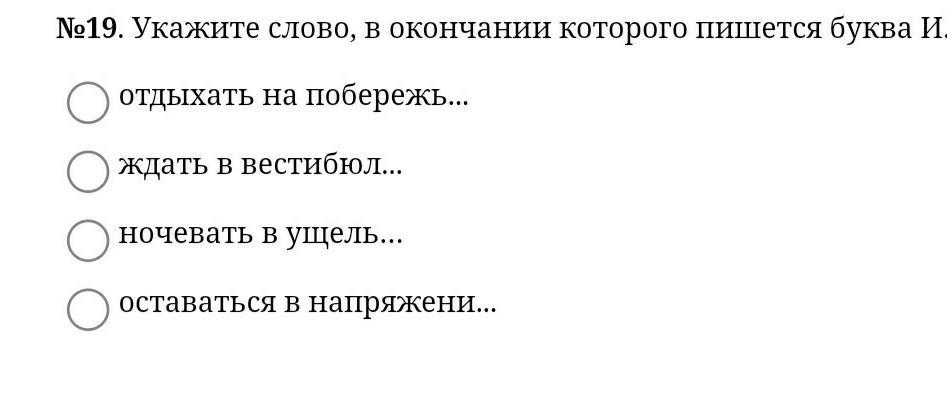 №19. Укажите слово, в окончании которого пишется буква И. отдыхать на побережь... ждать в вестибюл... ночевать в ущель... оставаться в напряжени.