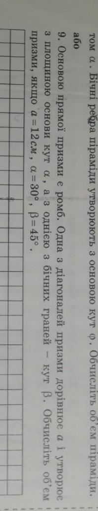 Основою прямої призми е ромб. Одна з діагоналей призми дорівнює і утворю 3 площиною основи кут а, а з однією з бічних граней кут В. Обчисліть об'ем призми, якщо а = 12 см, а = 30°, B=45°