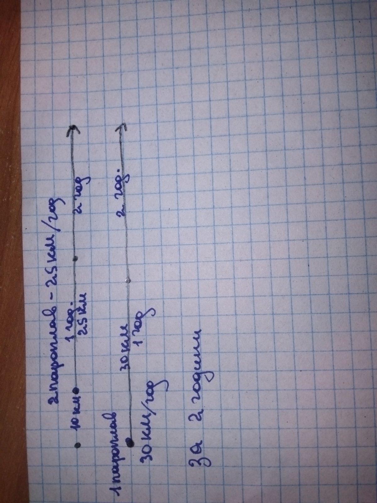 Вiд двох пристаней, відстань між якими 10 км, в одному на- прямку одночасно відійшли два пароплави. Швидкість першого пароплава 30 км/год, а другого 25 км/год. Через скільки годин перший пароплав наздожене другий?