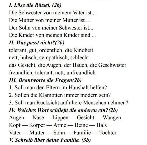 Variante 1 I. Löse die Rätsel. Die Schwester von meinem Vater ist... Die Mutter von meiner Mutter ist... Der Sohn von meiner Schwester ist... Die Kinder von meinen Kinder sind ... II. Was passt nicht? (2b) tolerant, gut, ordentlich, die Kindheit nett, hübsch, sympathisch, schlecht das Gesicht, die Augen, der Bauch, die Geschwister freundlich, tolerant, nett, unfreundlich III. Beantworte die Fragen 1. Soll man den Eltern im Haushalt helfen? 2. Sollen die Klamotten immer modern sein? 3. Soll man Rücksicht auf ältere Menschen nehmen? IV. Welches Wort schließt die anderen ein? (2b) Augen-Nase- Lippen-Gesicht - Wangen Kopf- - Körper -Arme Beine - Hals Vater Mutter-Sohn - Familie - Tochter V. Schreib über deine Familie.