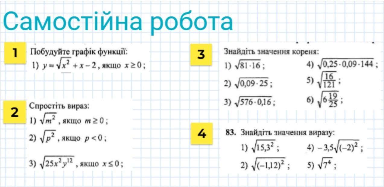 Самостійна робота 3 1 Побудуйте графік функції: 1) у = √х² + x −2, якщо x 0; 2 Спростіть вираз: 1) √m² , якщо m 2 0 ; 2) √P², якщо р < 0; 3) 25х22, якщо х50; 4 Знайдіть значення кореня: 1) √√81-16; 2) √0,09-25; 3) √576-0,16; 4) √0,25-0,09-144; 5) 16 6) 613 ; 83. Знайдіть значення виразу: 1) √15,32 ; 2) √(-1,12)²; 4) -3,5√√(-2)²; 5) √7ª;