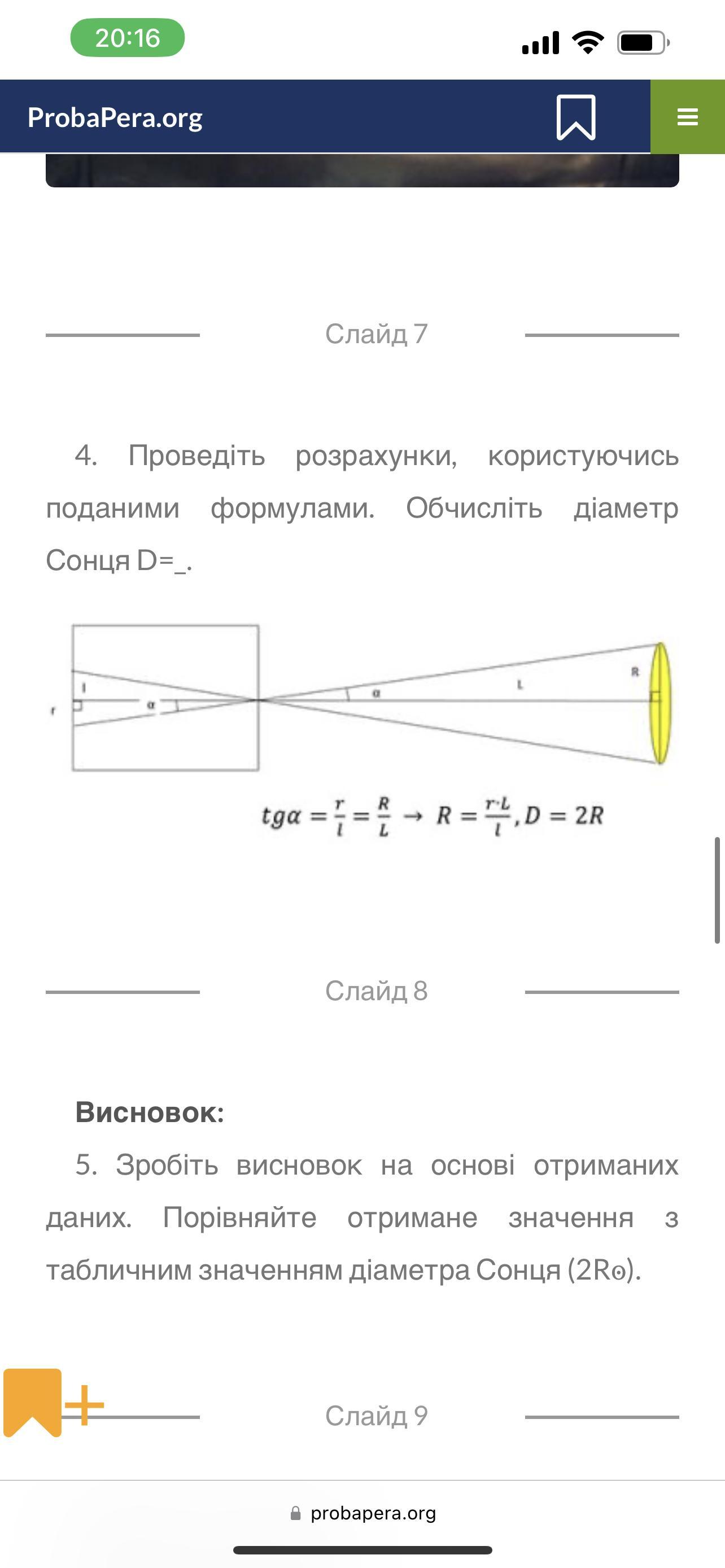 Проведіть розрахунки, користуючись поданими формулами. Обчисліть діаметр Сонця D=_.