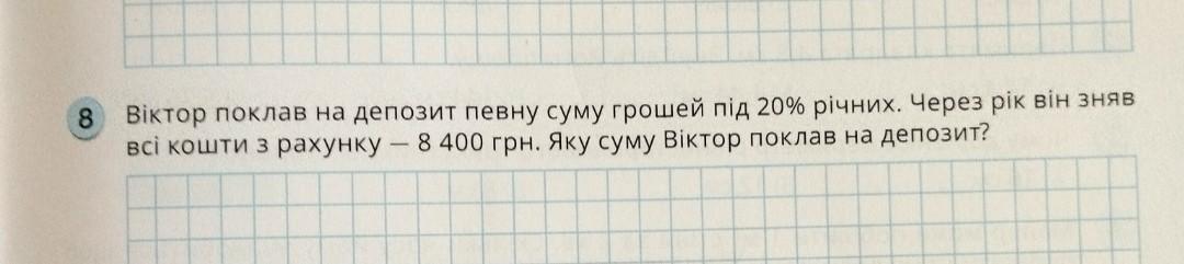 Поклав х грн - 100%, зняв 8400грн -120%. Звідси х=8400*100/120=7000грн