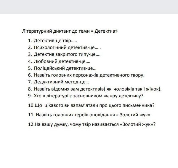Літературний диктант до теми « Детектив» дати відповідь на запитання все на фото 40 балов