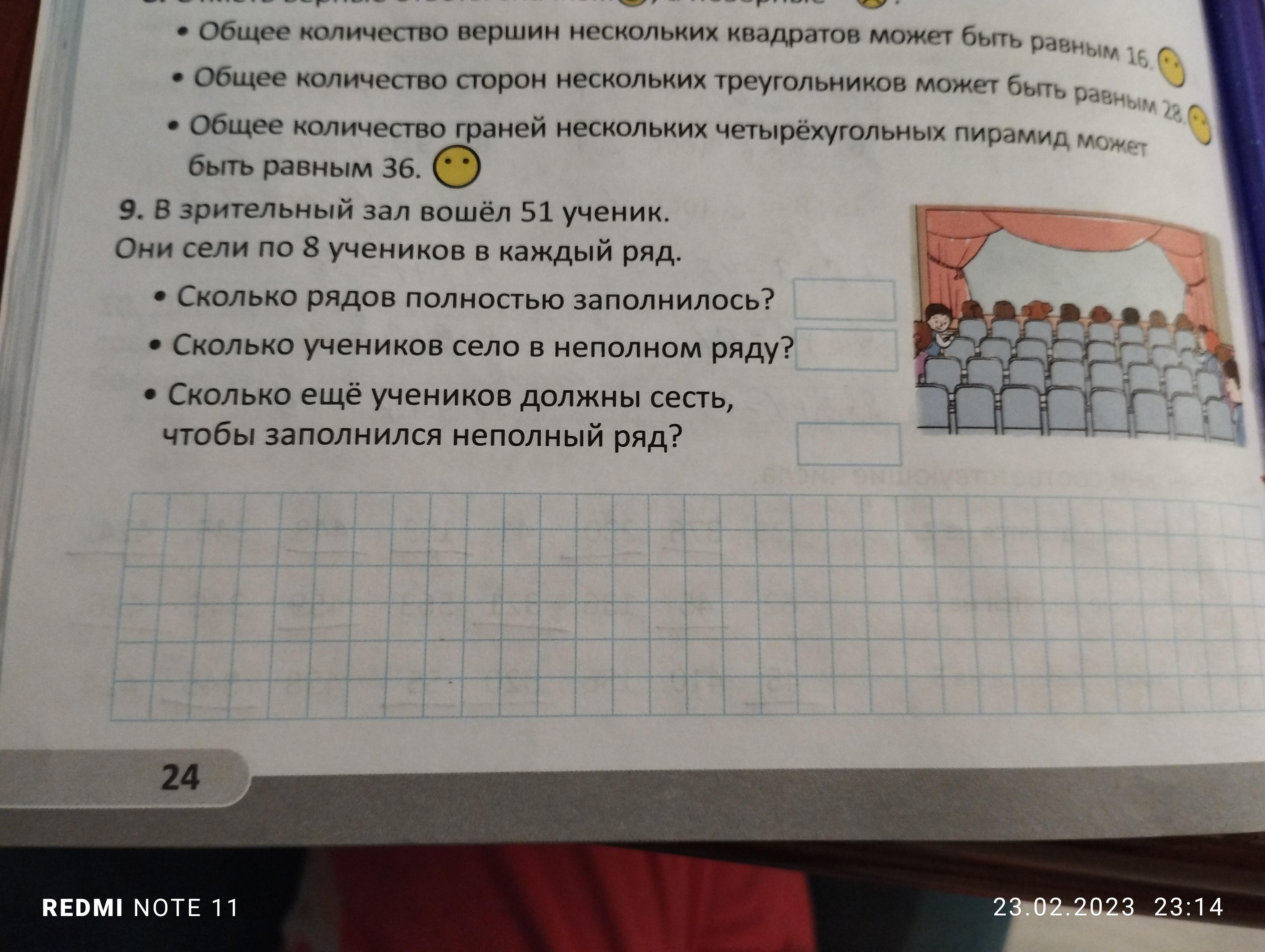 51/8 = 6 3/8, то есть занято 6 рядов по 8 учеников целиком.