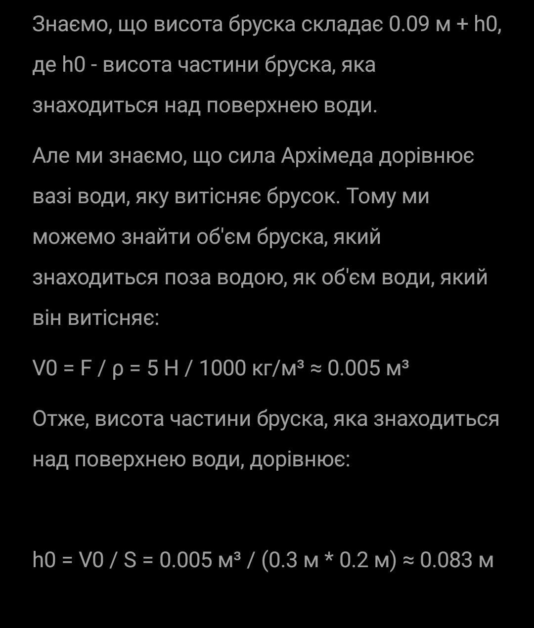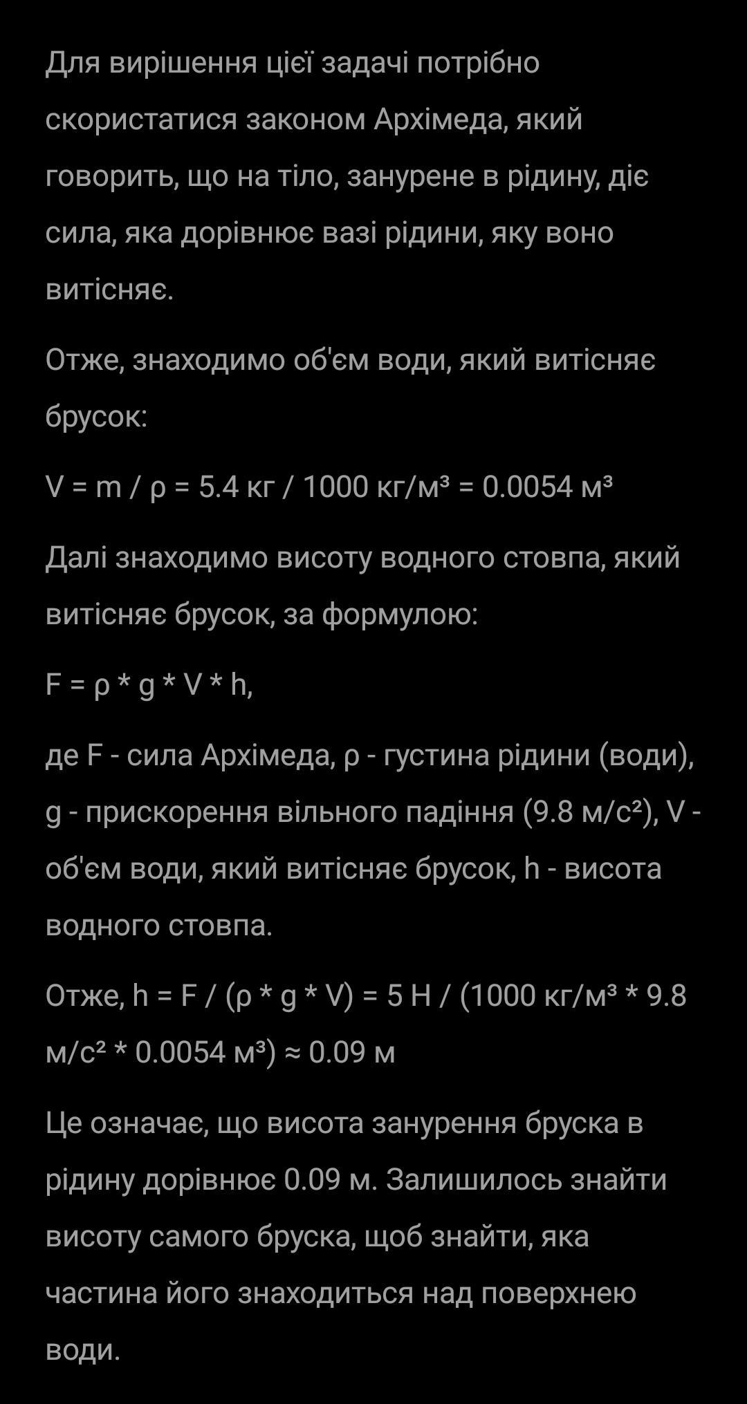2. Алюмінієвий вантаж масою 5,4 кг частково занурений у воду. При цьому на брусок діє сила Архімеда 5 Н. Яка частина бруска знаходиться над поверхнею води?