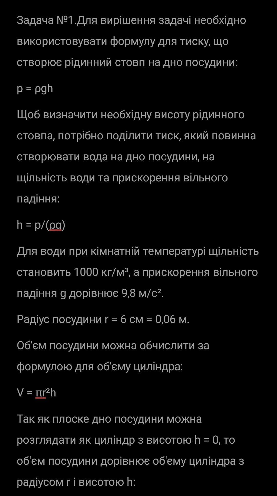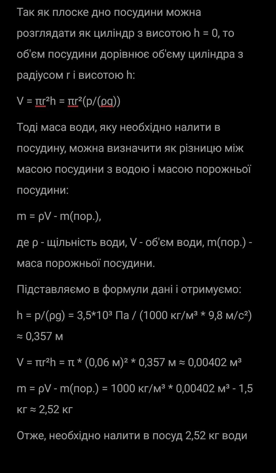 1. Плоске дно посудини має форму круга радіусу 6 см. Скільки води треба налити в посудину, щооб посудина на стіл створювала тиск 3,5 кПа? Ваажайте, що маса порожньої посудини 1,5 кг.