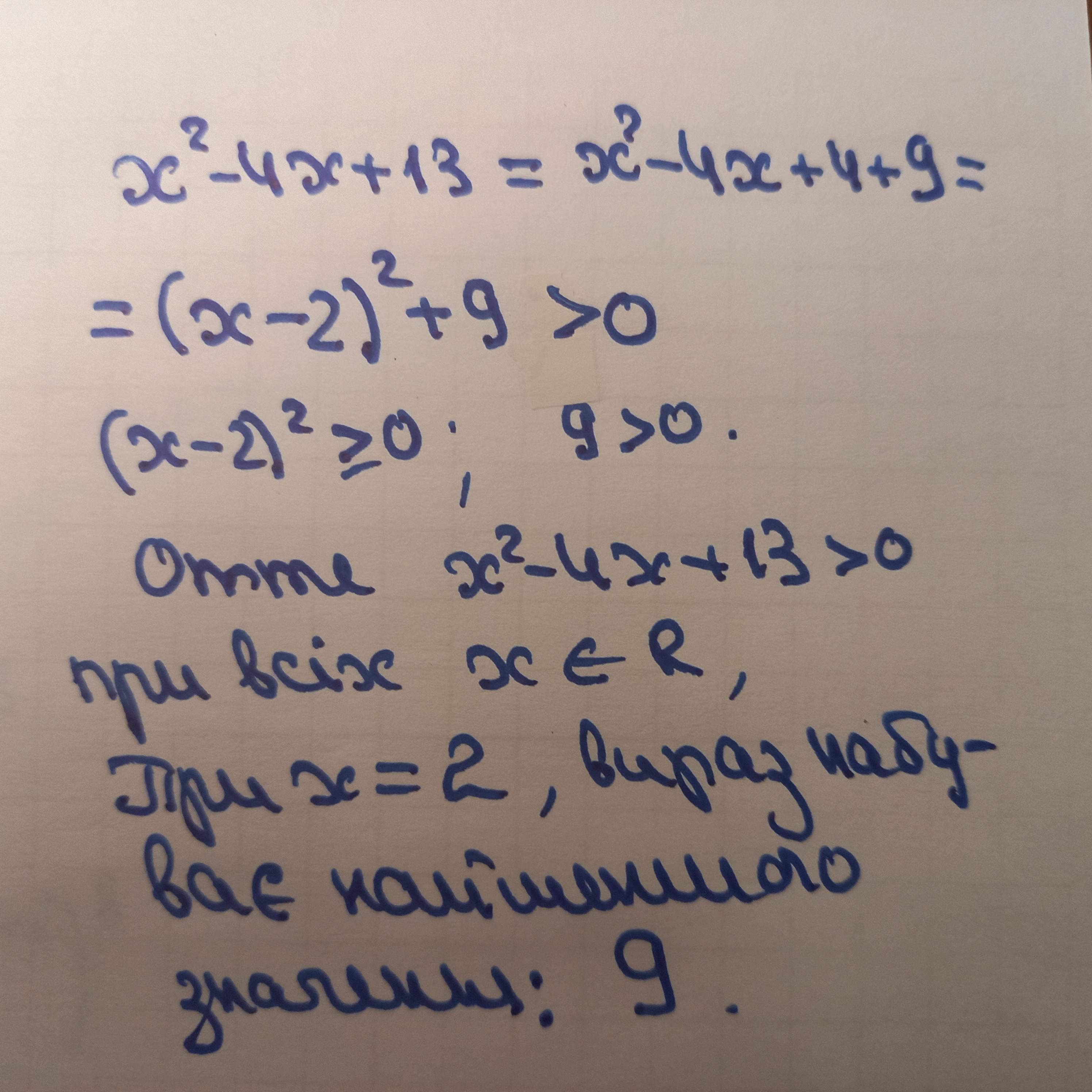 Доведіть, що вираз x² - 4x + 13 набуває лише до- датних значень при всіх значеннях х. Якого найменшого значення набуває цей вираз i при якому значенні х?