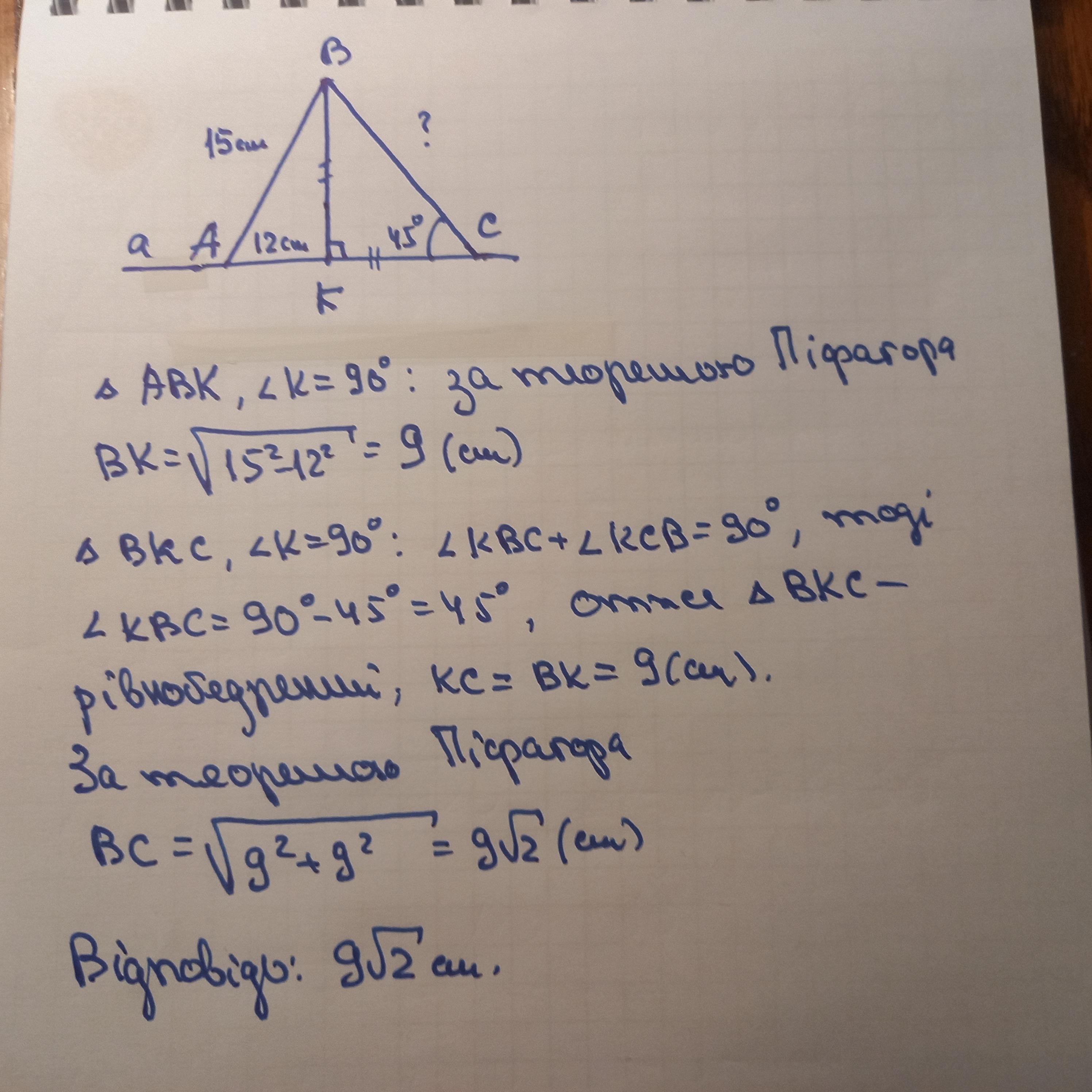 Із точки до прямої проведено дві похилі. Довжина однієї з них дорівнює 15 см, а її проекція на пряму - 12 см. Знайдіть довжину другої похилої, якщо вона утворює з даною прямою кут 45°