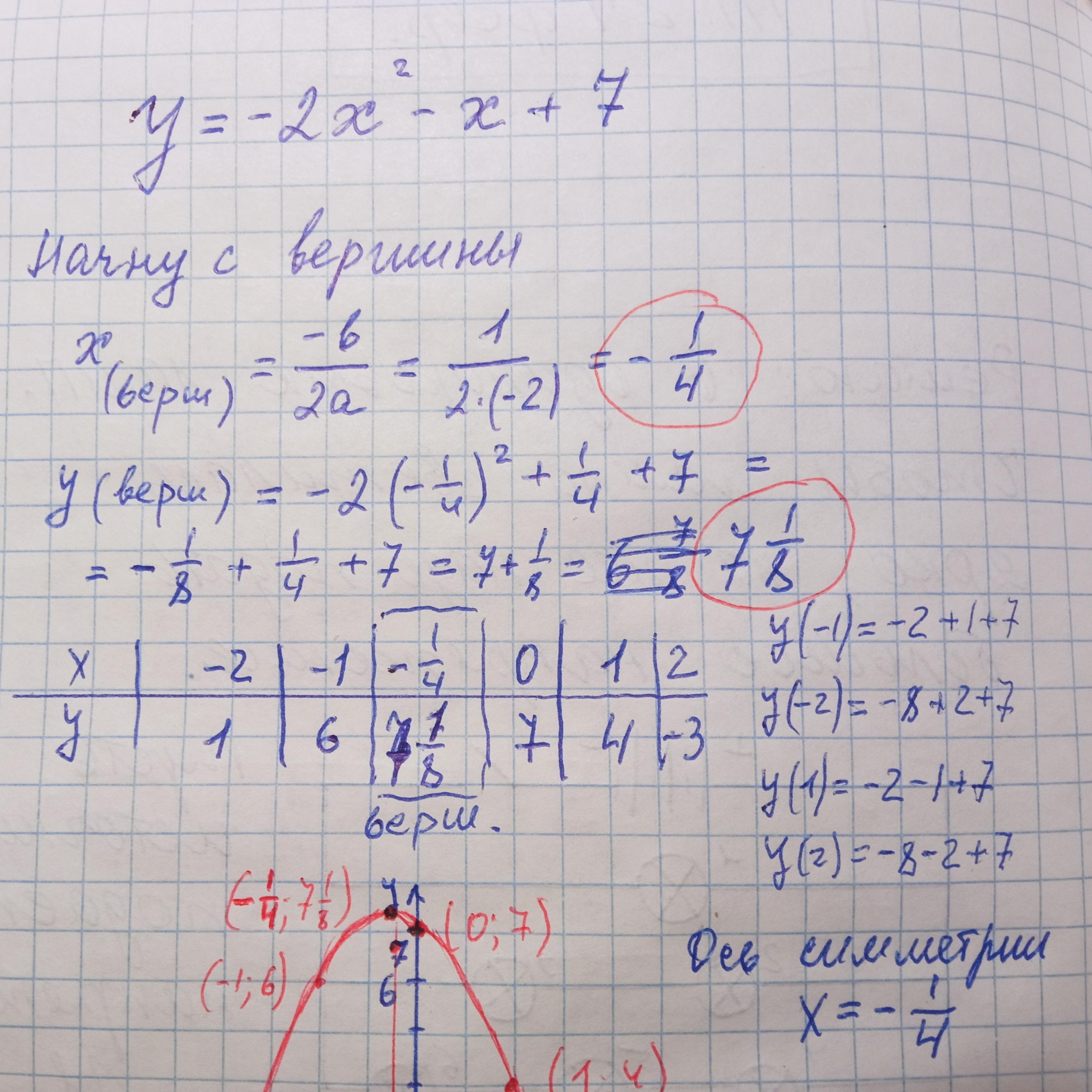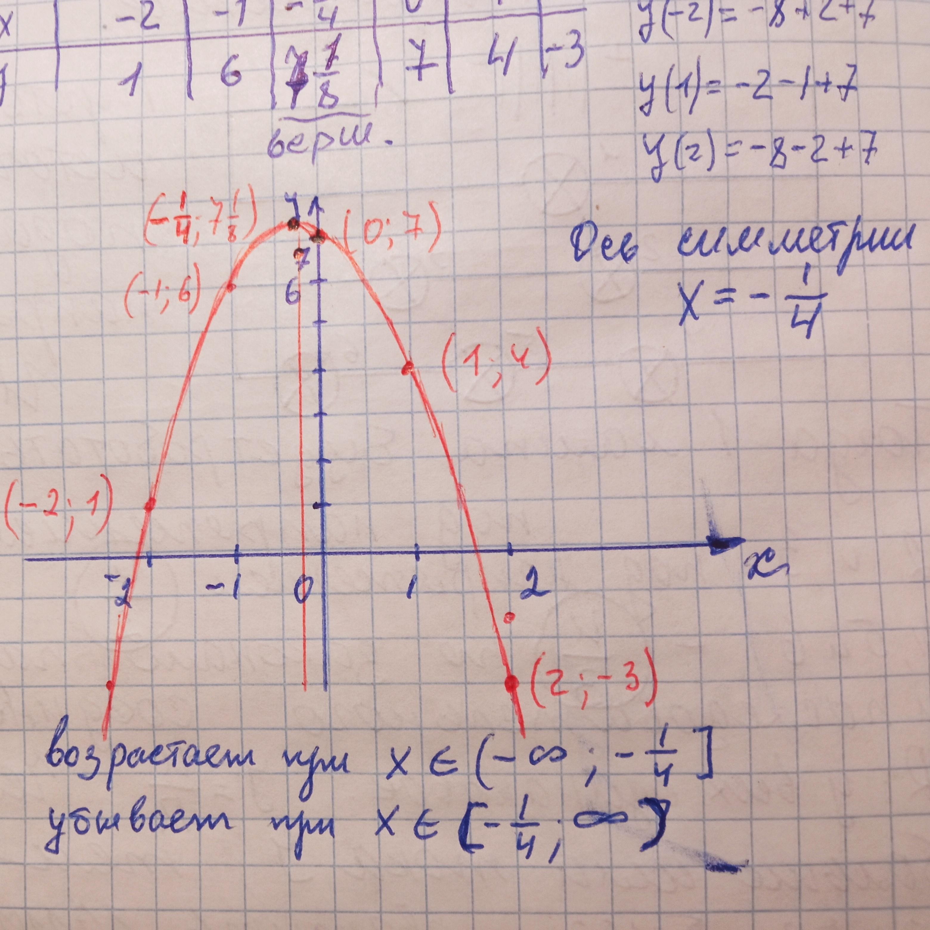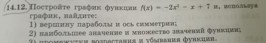 пж Постройте график функции f(x) = -2x² - х + 7 и, используя график, найдите: 1) вершину параболы и ось симметрии; 2) наибольшее значение и множество значений функции; 3) промежутки возрастания и убывания функции.