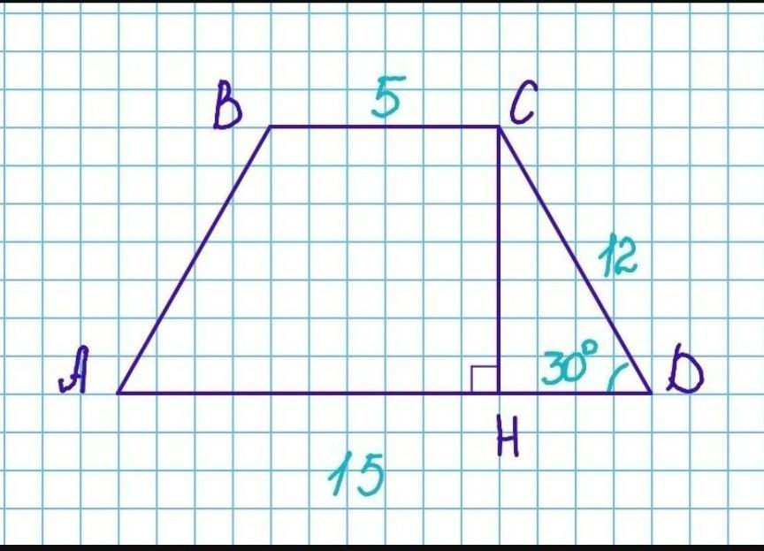 СН⟂AD, следовательно △CHD - прямоугольный. По условию гипотенуза CD=12см, а ∠D=30°.
