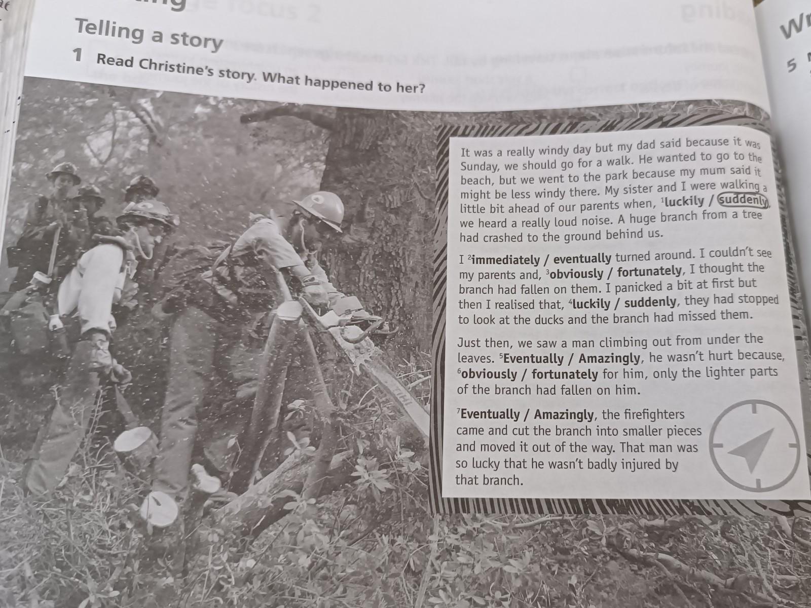 It was a really windy day but my dad said because it was Sunday, we should go for a walk. He wanted to go to the beach, but we went to the park because my mum said it might be less windy there. My sister and I were walking a little bit ahead of our parents when, 'luckily / suddenly, we heard a really loud noise. A huge branch from a tree had crashed to the ground behind us. I immediately / eventually turned around. I couldn't see my parents and, 3³obviously / fortunately, I thought the branch had fallen on them. I panicked a bit at first but then I realised that, 'luckily / suddenly, they had stopped to look at the ducks and the branch had missed them. Just then, we saw a man climbing out from under the leaves. Eventually / Amazingly, he wasn't hurt because, obviously / fortunately for him, only the lighter parts of the branch had fallen on him. Eventually / Amazingly, the firefighters came and cut the branch into smaller pieces and moved it out of the way. That man was so lucky that he wasn't badly injured by that branch.