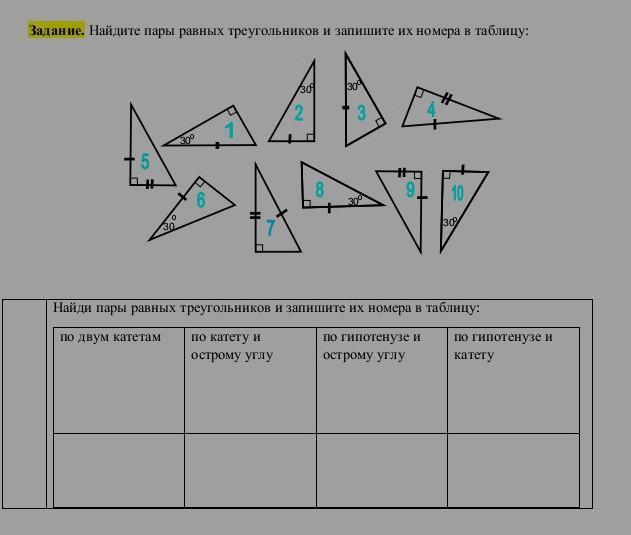 Задание. Найдите пары равных треугольников и запишите их номера в таблицу: 30 30 2 3 1 долва здат 6 8 7 5 9. 10 30% Найди пары равных треугольников и запишите их номера в таблицу: по двум катетам по катету и острому углу по гипотенузе и острому углу по гипотенузе и катету