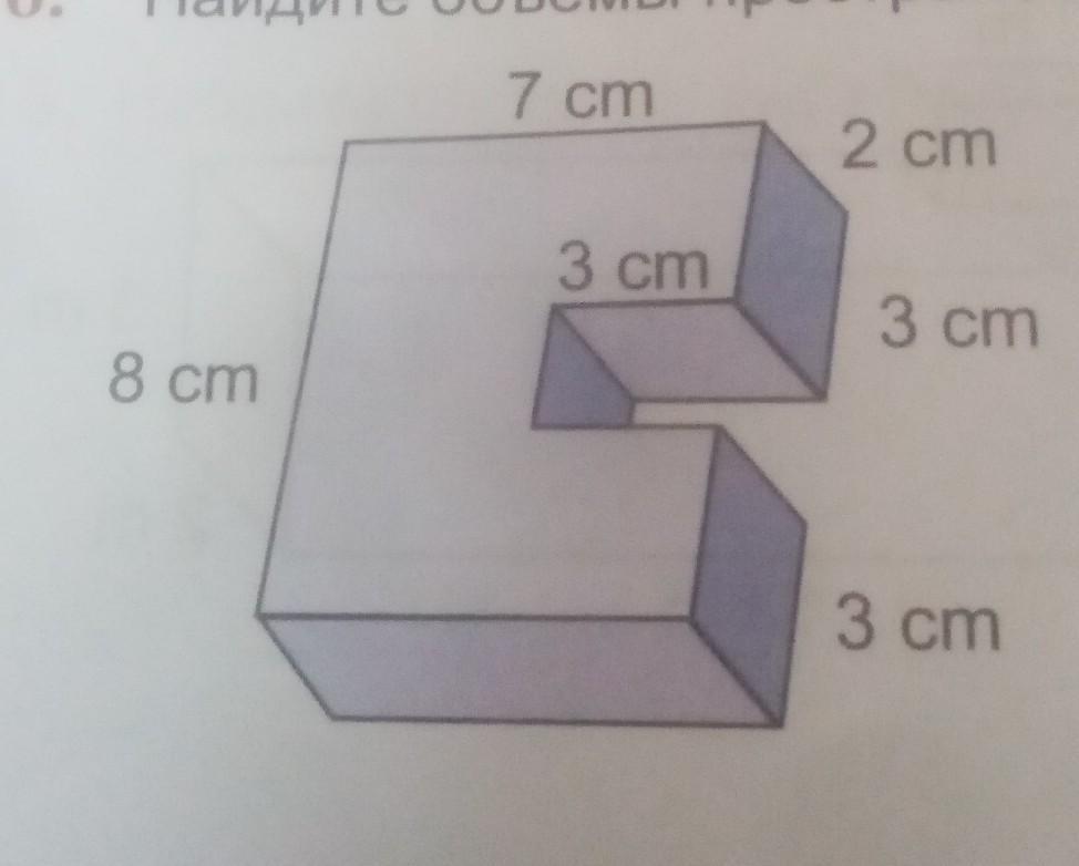 Объем фигуры равен произведению площади основания на высоту. Площадь основания равна разнице площади прямоугольника 8 × 7 и выступа 3 × 2. Получаем обьем равен ( 8 × 7 - 3 × 2 ) × 2 = ( 56 - 6 ) × 2 = 50 × 2 = 100 см³.