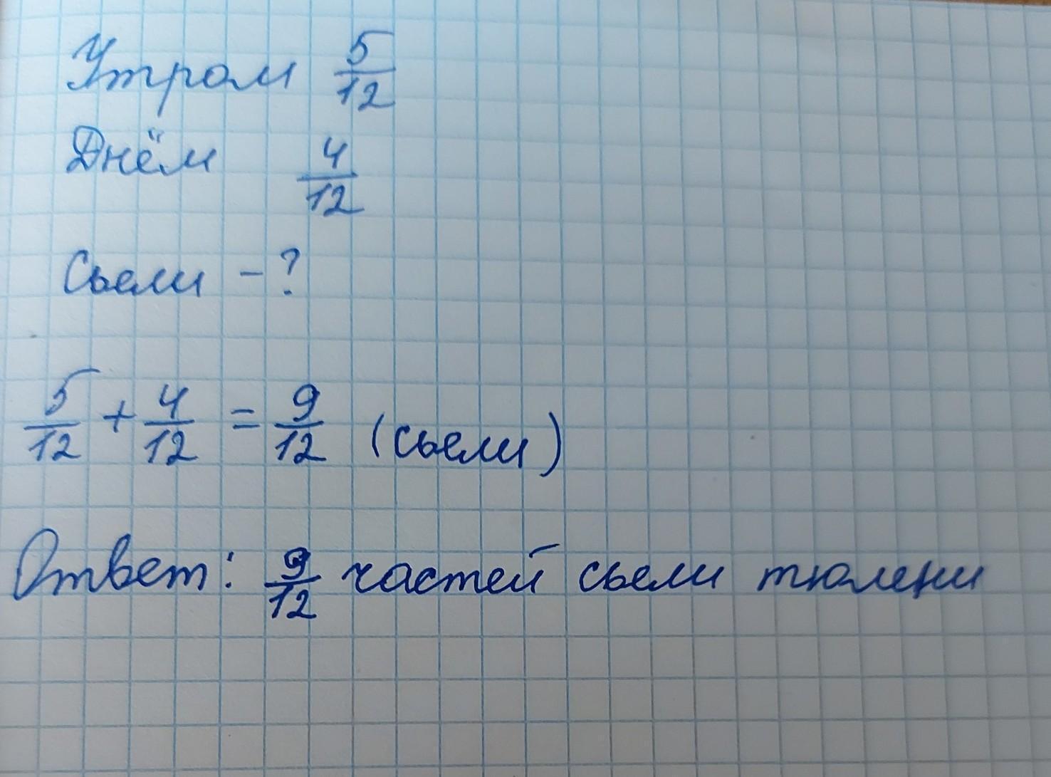 а) Для сохранения тюленей B Kacпийскoм море их подкармливают килькой. Сегодня приготовили партию рыбы. Утром тюлени съели 5/12 частей приготовленной рыбы, днём - ещё 4/12 Сколько частей кильки съели тюлени?