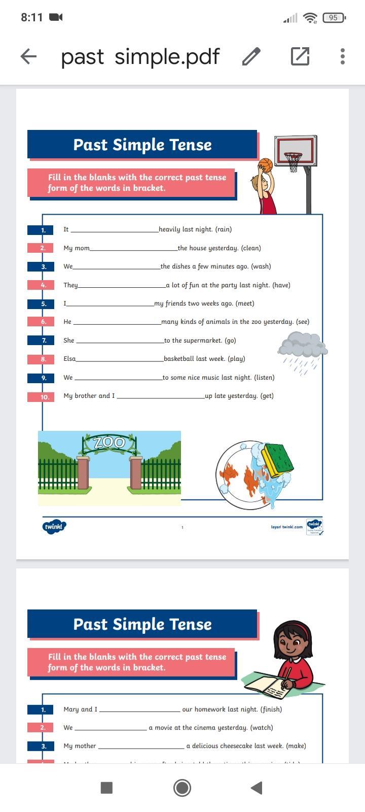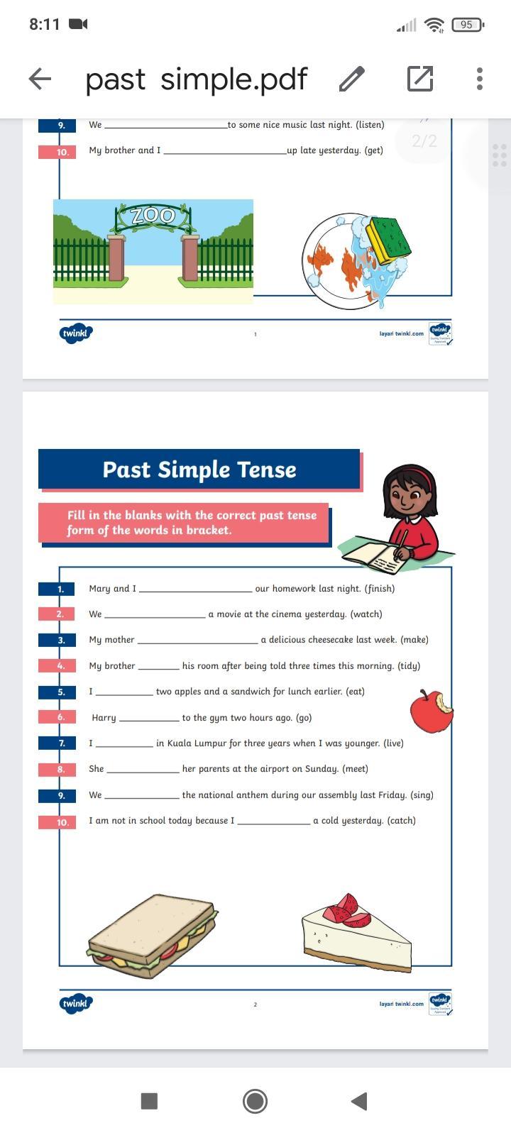 1. It rained heavily last night. 2. My mom cleaned the house yesterday. 3. We washed the dishes a few minutes ago. 4. They had a lot of fun at the party last night. 5. I met my friends two weeks ago. 6. He saw many kinds of animals in the zoo yesterday. 7. She went to the supermarket. 8. Elsa played basketball last week. 9. We listened to some nice music last night. 10. My brother and I got up late yesterday. 1. Mary and I finished our homework last night. 2. We watched a movie at the cinema yesterday. 3. My mother made a delicious cheesecake last week. 4. My brother tidied his room after being told three times this morning. 5. I ate two apples and a sandwich for lunch earlier. 6. Harry went to the gym two hours ago. 7. I lived in Kuala Lumpur for three years when I was younger. 8. She met her parents at the airport on Sunday. 9. We sang the national anthem during our assembly last Friday. 10. I am not at school today because I caught a cold yesterday.
