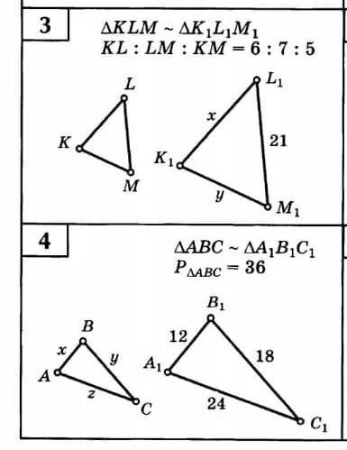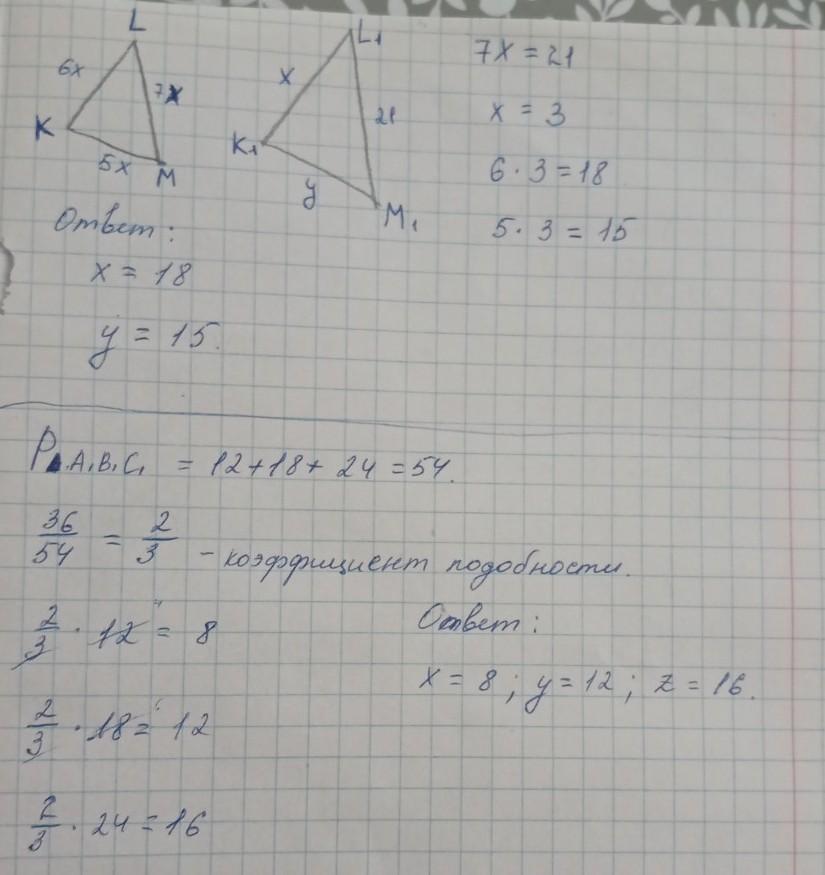 3 4 A M L 4.4 Kid M y K AKLM-AK₁L₁M₁ KL: LM: KM=6:7:5 L₁ B y C M₁ AABC - AA1B1C1 PAABC= 36 B₁ 12, Aid 21 24 18 C₁