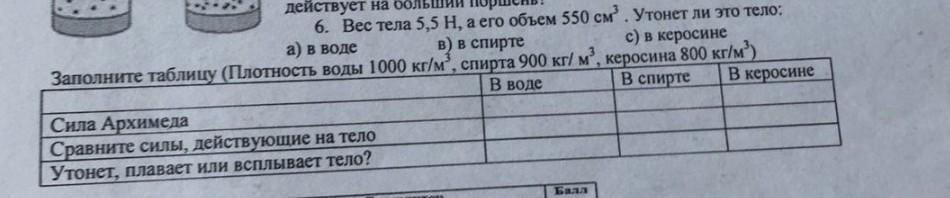 6. Вес тела 5,5 Н, а его объем 550 см3. Утонет ли это тело: с) в керосине a) в воде в) в спирте Заполните таблицу (Плотность воды 1000 кг/м3, спирта 900 кг/ м3, керосина 800 кг/м²) В спирте В керосине В воде Сила Архимеда Сравните силы, действующие на тело Утонет, плавает или всплывает тело?