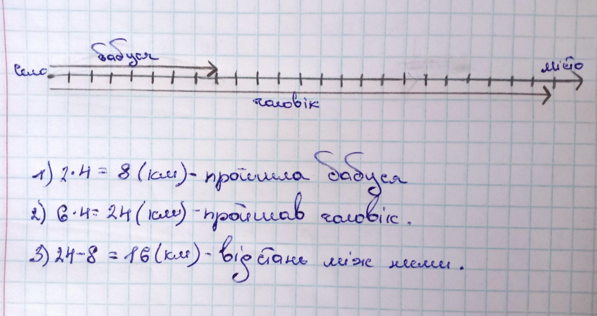 бабуся і чоловик вийшли із одного села одночасно і пішли до міста одніею дорогою.швидкість бабусі 2 км в год а чоловік 6 км в год зобрази їх рух на числовому промені та знайди відстань між ними через 4 год після початку руху