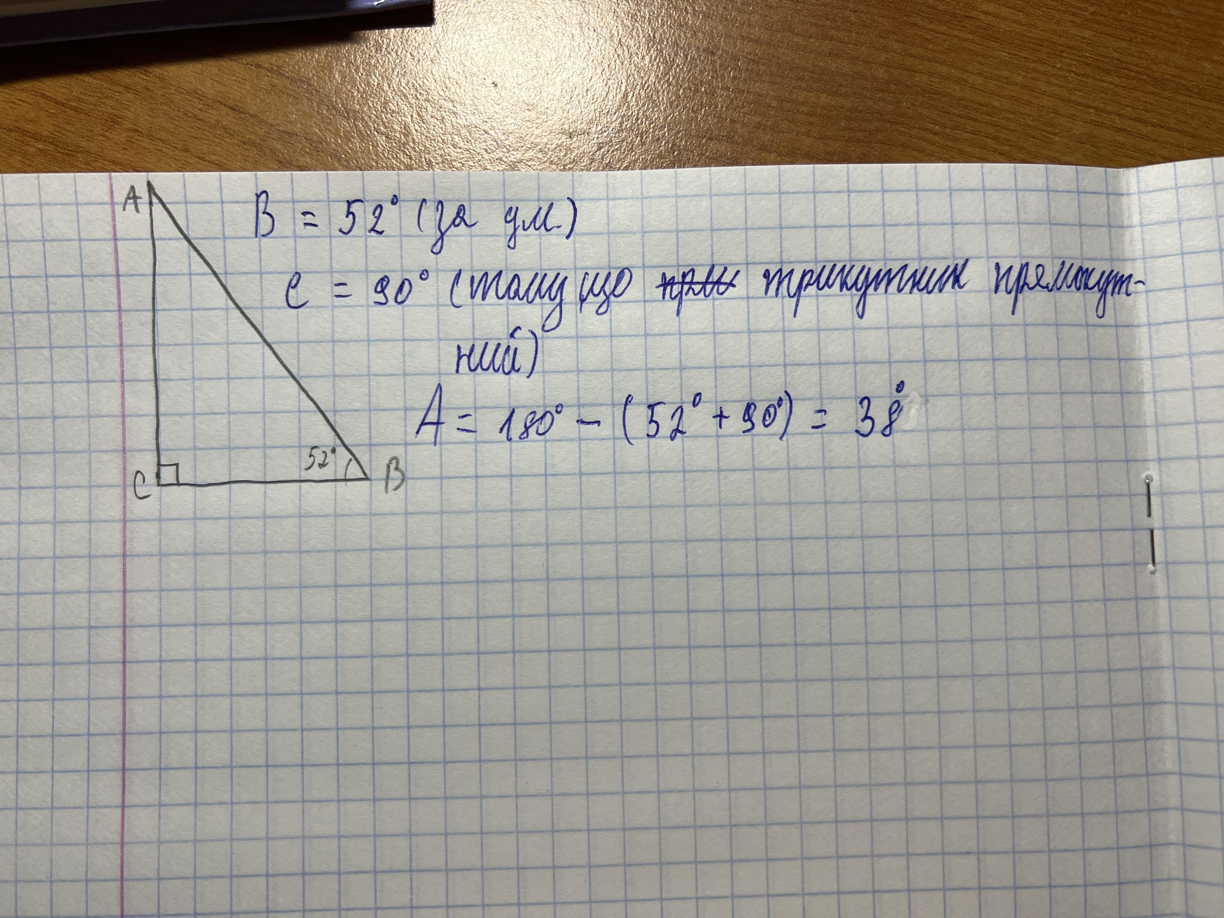 у прямокутному трикутнику один із кутів дорівнюе 52° визнач величину другого гострого кута цього трикутника