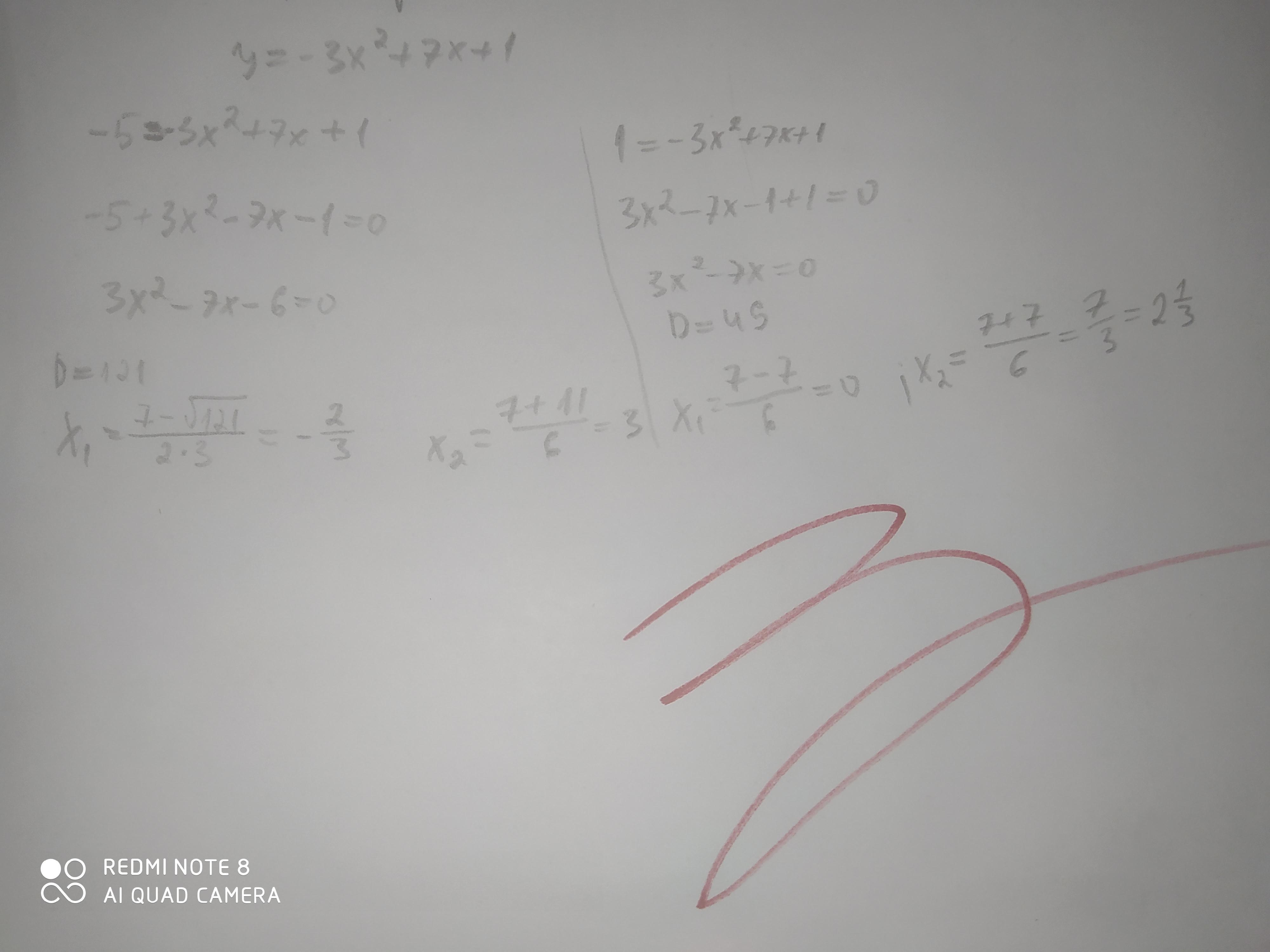 Найти значение х, при которых квадратичная функция y= -3x²+7x+1 принимает значение: а) -5; б) 1.
