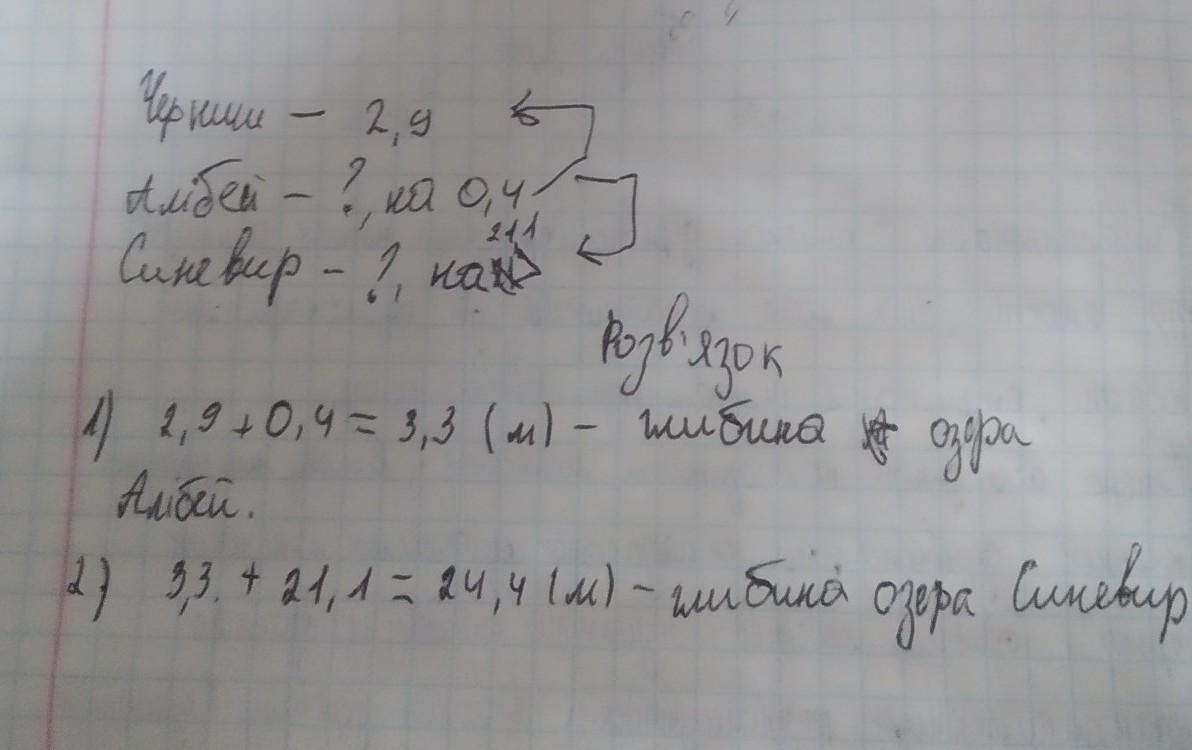 Найбільша глибина озера Чорниш становить 2,9 м, що на 0,4 більше, ніж глибина озера Алібей, і на 21,1 менше, ніж глибина озера Синевир.Обчисли глибину озера Алібей і озера Синевир.