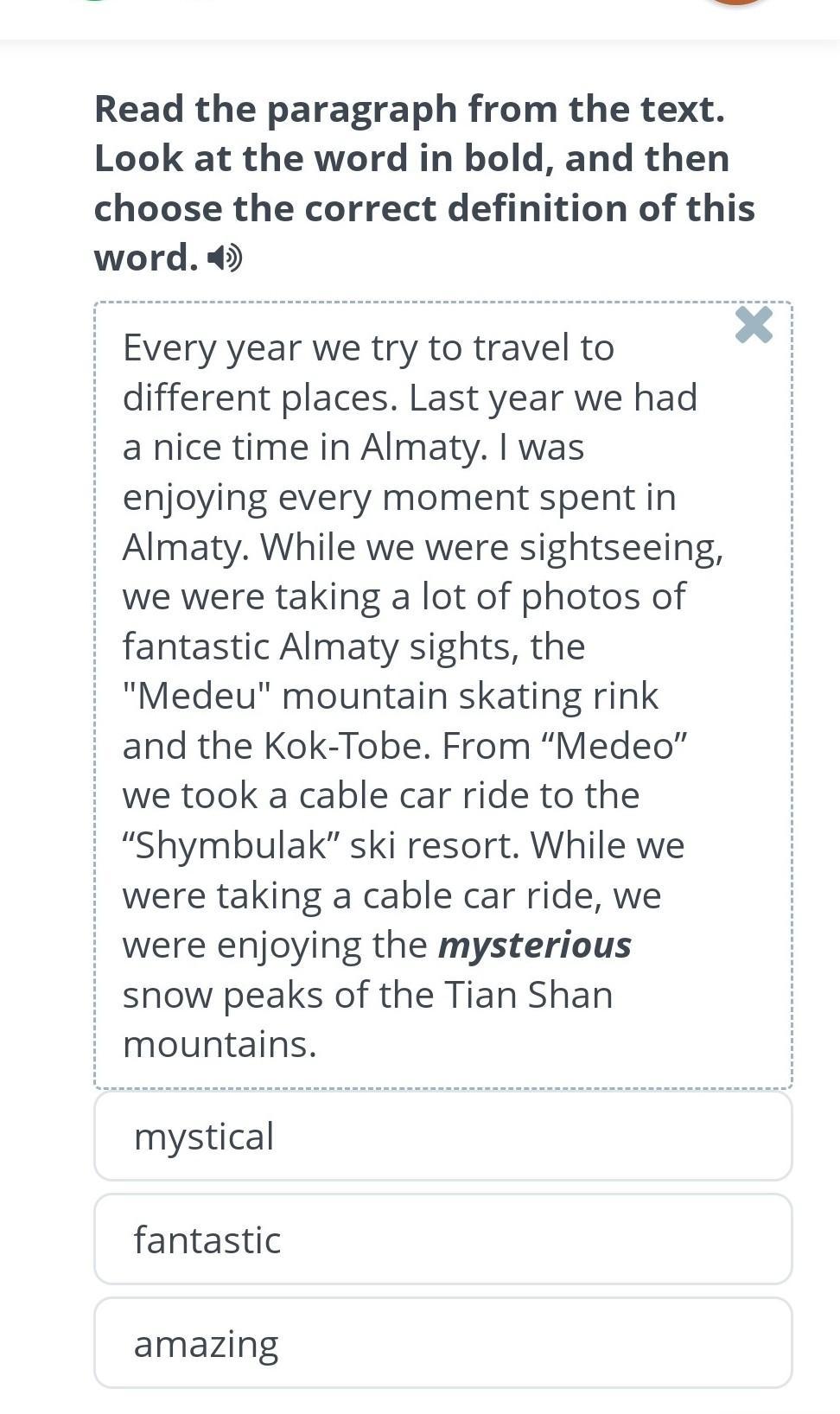 Read the paragraph from the text. Look at the word in bold, and then choose the correct definition of this word. Every year we try to travel to different places. Last year we had a nice time in Almaty. I was enjoying every moment spent in Almaty. While we were sightseeing, we were taking a lot of photos of fantastic Almaty sights, the "Medeu" mountain skating rink and the Kok-Tobe. From "Medeo" we took a cable car ride to the "Shymbulak" ski resort. While we were taking a cable car ride, we were enjoying the mysterious snow peaks of the Tian Shan mountains. mystical fantastic amazing X