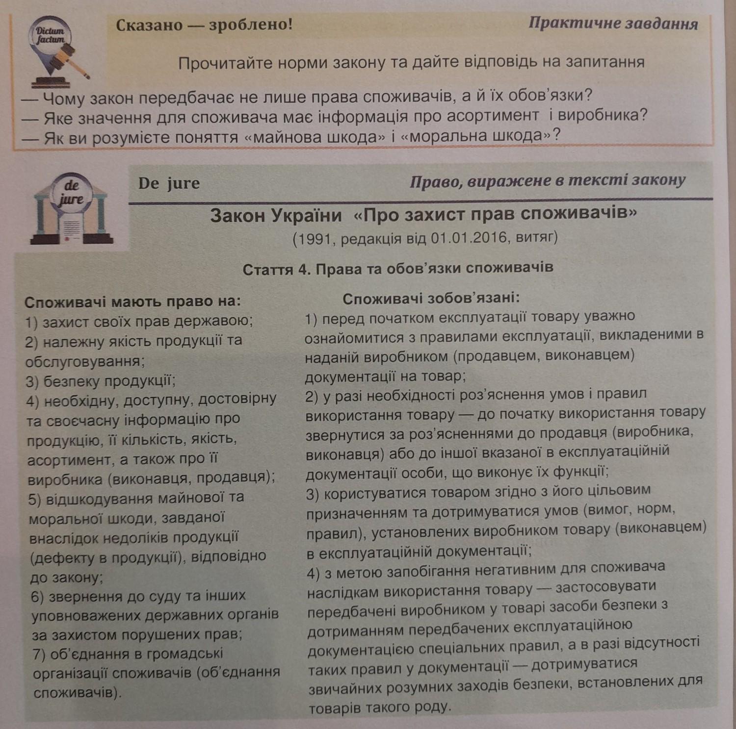 Закон про захист прав споживачів передбачає не тільки права, але й обов’язки споживачів, оскільки взаємовідносини між продавцем та споживачем мають двосторонній характер. Споживач має не тільки право на якісний товар та послуги, але й обов’язок розуміти, що він купує. Він повинен дотримуватися умов договору, вносити своєчасні платежі, не завдаючи шкоди майну продавця, не порушувати правила користування товаром. Також, споживач має обов’язок виявляти обережність при користуванні певними товарами, які можуть бути небезпечними (наприклад, при користуванні побутовою хімією або електроприладами).