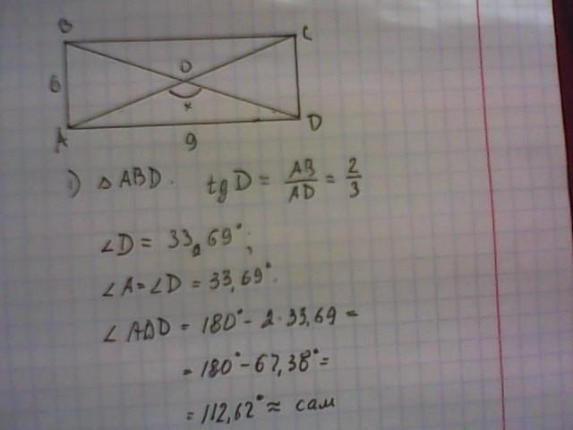 (36) Сторони прямокутника дорівнюють 8 см і 16 см. Знайдіть тупий кут між двома діагоналями прямокутника (з точністю до градуса).