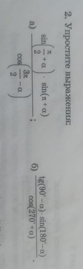 2. Упростите выражения: sin(л+а) a) sin П 2 + a COS . Зл 2 -a 6) tg(90º-a) sin(180°-a) cos(270°+a)