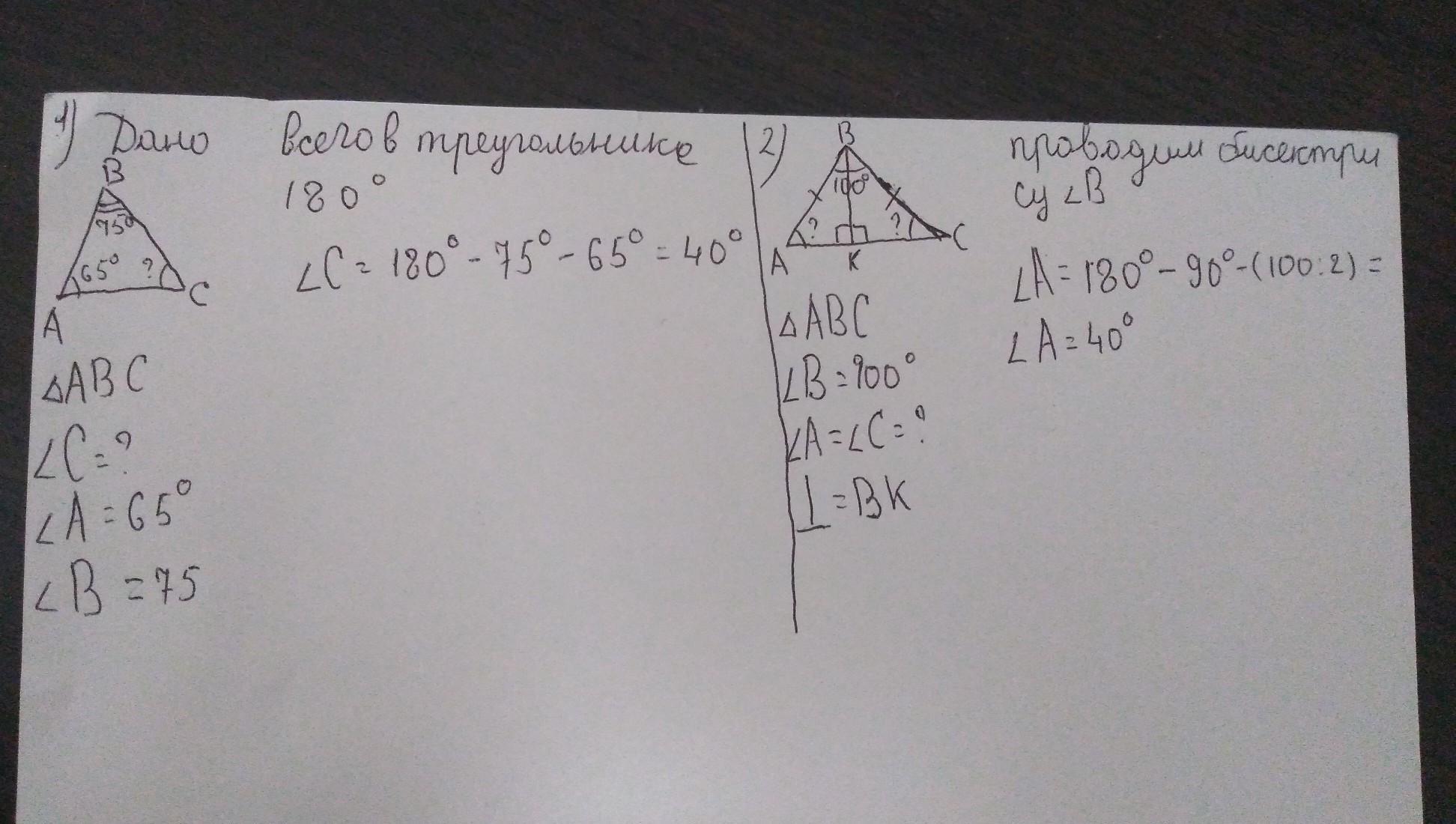 2) Можно проще. Углы при основании равны. <А=<С=(180-100)/2=40°))
