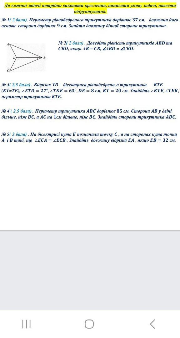 № 1( 2 бала). Периметр рівнобедреного трикутника дорівнює 37 см, довжина його основи сторони дорівнює 9 см. Знайти довжину бічної сторони трикутника. B № 2(2 бала). Доведіть рівність трикутників ABD та CBD, якщо AB = CB, ZABD = 2CBD. № 3( 2,5 бала). Відрізок TD - бісектриса рівнобедреного трикутника KTE (KT=TE), LETD = 27°,