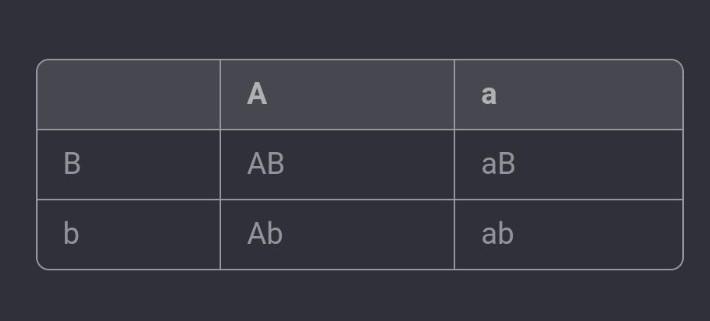 Отже, нащадки матимуть генотипи "AaBb", "Aabb", "aaBb" та "aabb". Тобто, у першому поколінні будуть присутні як гетерозиготи, так і гомозиготи рецесивні для обох ознак.