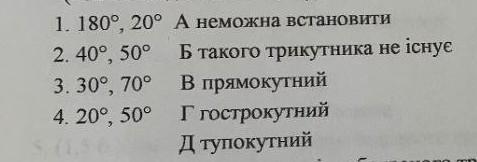 Встановіть відповідність між кутами трикутника та його видом. В трикутнику дано два кути.