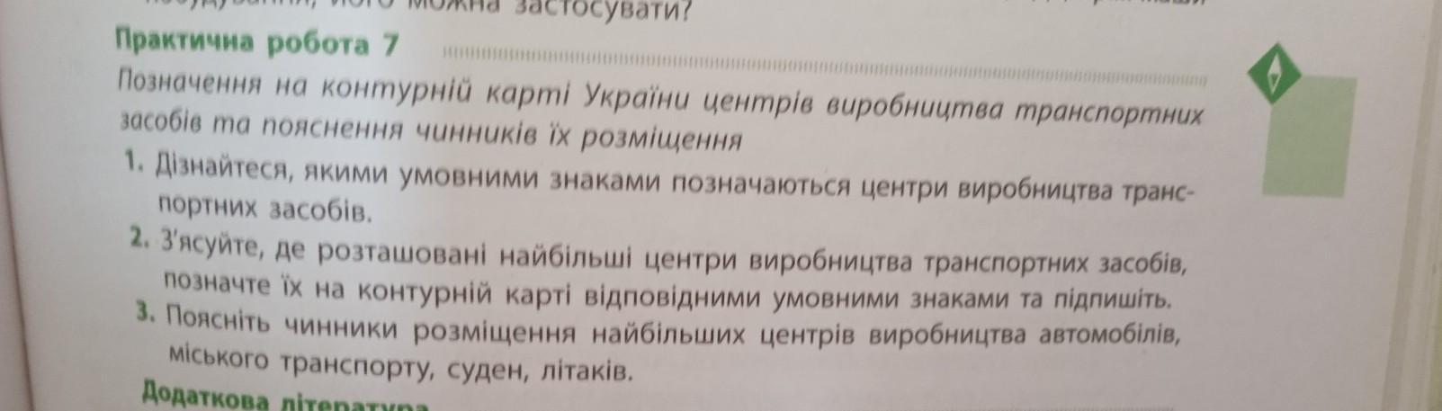 на цьому уроці я навчився позначати на контурній карті України центри виробництва транспортних засобів і також я дізнався про чинники та їх розміщення, також я дізнався якими знаками позначаються центри виробництва транспортних засобів