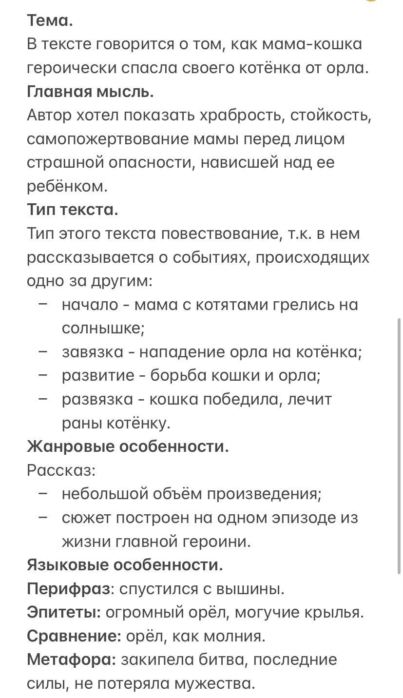 - Жанровые особенности текста - рассказ, драматическая композиция, описание битвы. Языковые особенности - использование эпитетов (могучие крылья, крепкий клюв), метафор (как молния), повторов (схватил).