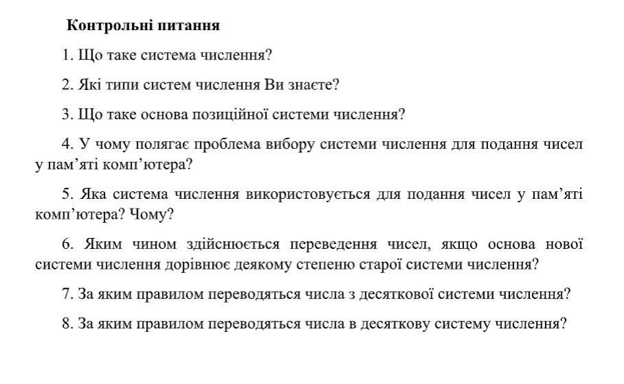 7. Перевод числа з десяткової системи числення здійснюється шляхом ділення вихідного числа на основу нової системи числення та запису остачі, потім ділення націло отриманої частини на основу нової системи числення