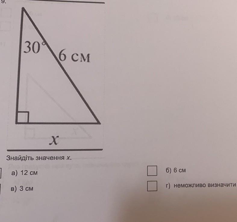 Катет який лежить навпроти кута 30 градусів дорівнює половині гіпотенози, тобто 3 см